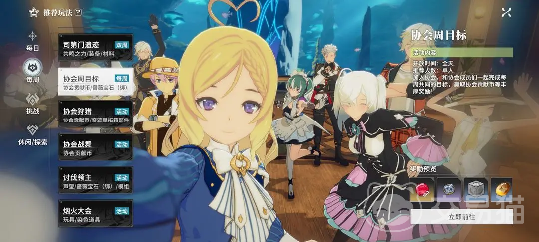 3、协会周目标。这是加入协会后的单人玩法,可和协会成员共同完成目标。4、协会狩猎。每周五晚上才开放,建议2-4人前往,活动开启之后,一起组队去猎场狩猎。4、协会战舞。也是周五晚上到周日开放,单人的模式,可以在协会活动中心来展示舞姿,能给参与狩猎的战友带阿狸增益。5、讨伐领主。单人组队都可以,能和最多20名玩法共同战斗,写手击败领主。6、烟火大会。休闲浪漫的玩法。