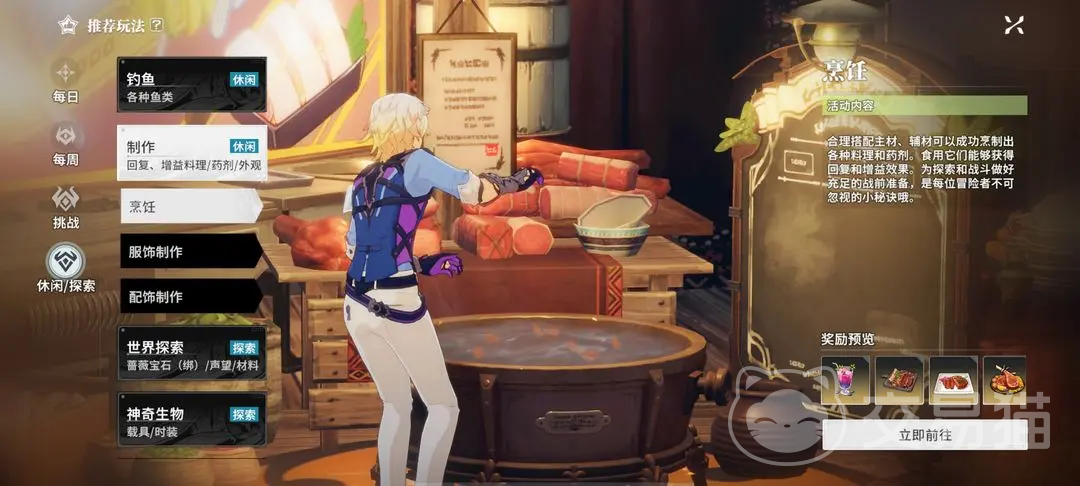 1、钓鱼,钓鱼是很休闲的玩法。2、制作玩法,烹饪、制作服饰,配饰,烹饪出的食物能作为药剂使用,可获得回复增益效果,是战前准备的重要渠道。3、世界探索,探索未知区域,获得珍贵宝藏。