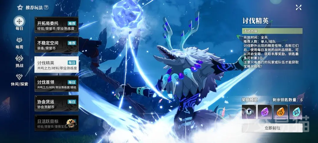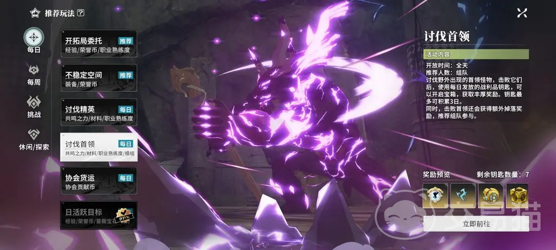 1、每日讨伐首领。这个模式是全天都开放的,建议是大家组队前往,野外会有首领怪物出现,将其击败之后,将每日系统给的战利品钥匙使用,就能开启宝箱,拿到其中丰富的奖励,钥匙最多能累积三日;击败首领还会有额外的奖励掉落,单刷比较有难度,还是组队进行更加的高效。
