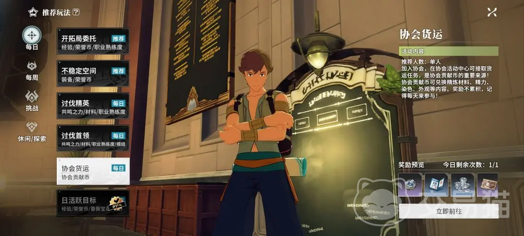 4、协会货运。比较建议单人进行,加入到协会当中,协会活动中心能接取货运的任务,这是协会贡献币的重要来源渠道,该道具能兑换精炼材料,经历,染色,外观等等,奖励也不会累积,建议每日都参与。