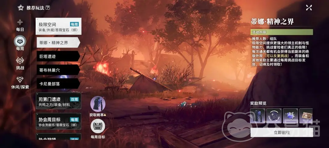 1、每周极限空间。推荐组队去玩,这里能提供更加强大的领主机制和怪物能力,这里会挑战大家真正的极限,每一次通关都有概率获得当前副本的绝版外观,能反复去挑战,装备和奖励是通过每周挑战目标发放。