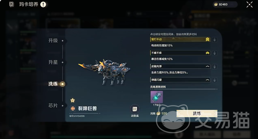 词条洗练:词条有三种不同品质,从词条外观也能看出来,在洗练界面点击词条库,就能看到对应玛卡能洗练出来的所有词条,洗练需要消耗对应材料和亚金,在洗练之前,可以选择将想要保留的词条先锁住,这个操作需要消耗额外的高级材料洗练晶体,洗的不满意还能恢复之前的词条。