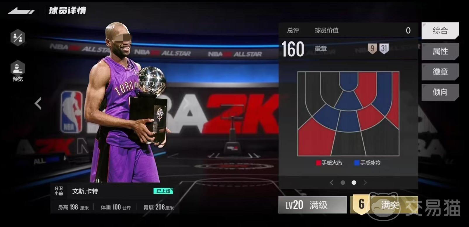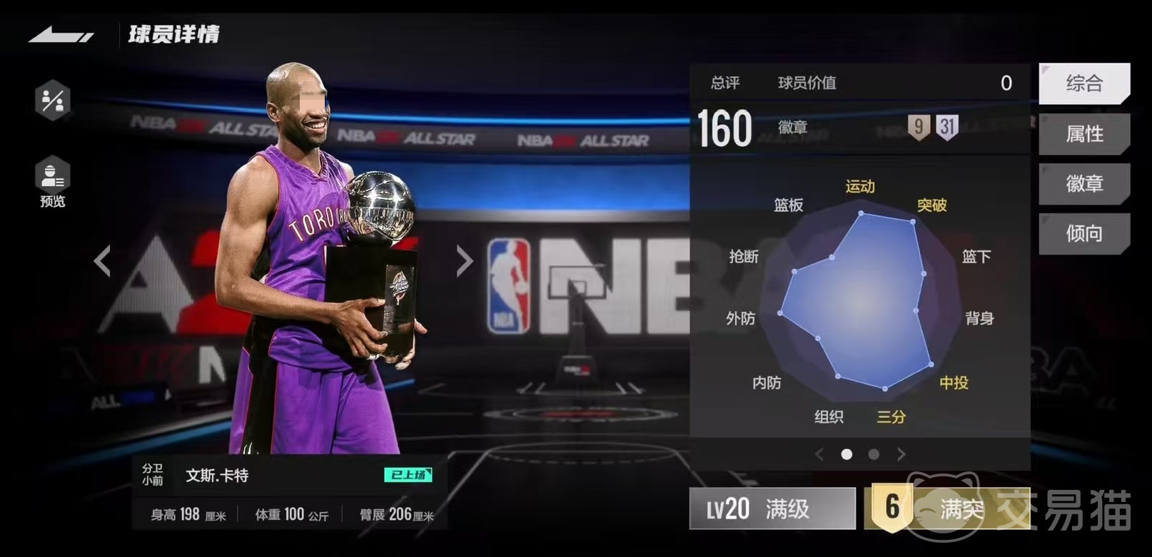接下来看一下详细的各项属性,文斯卡特在攻防两端都有强大实力,例如152的突破上篮属性,150的中投和145的三分,122的站扣以及168的跑扣,几乎将常规的进攻手段全都点满。无论大家选择在内线还是外线得分都非常轻松。其他方面,122的外防,133的横移,在防守对方外线球员时也比较有优势。虽然93的盖帽数值上不高,不过配合上自身168的弹跳,以及所具有的徽章,还是可以防守住大部分球员。还有145的速度和165的体力这两大属性,让卡特在场上几乎可以任意去发挥,他的下限就是很多球员的上限,确实说真的是数值怪。