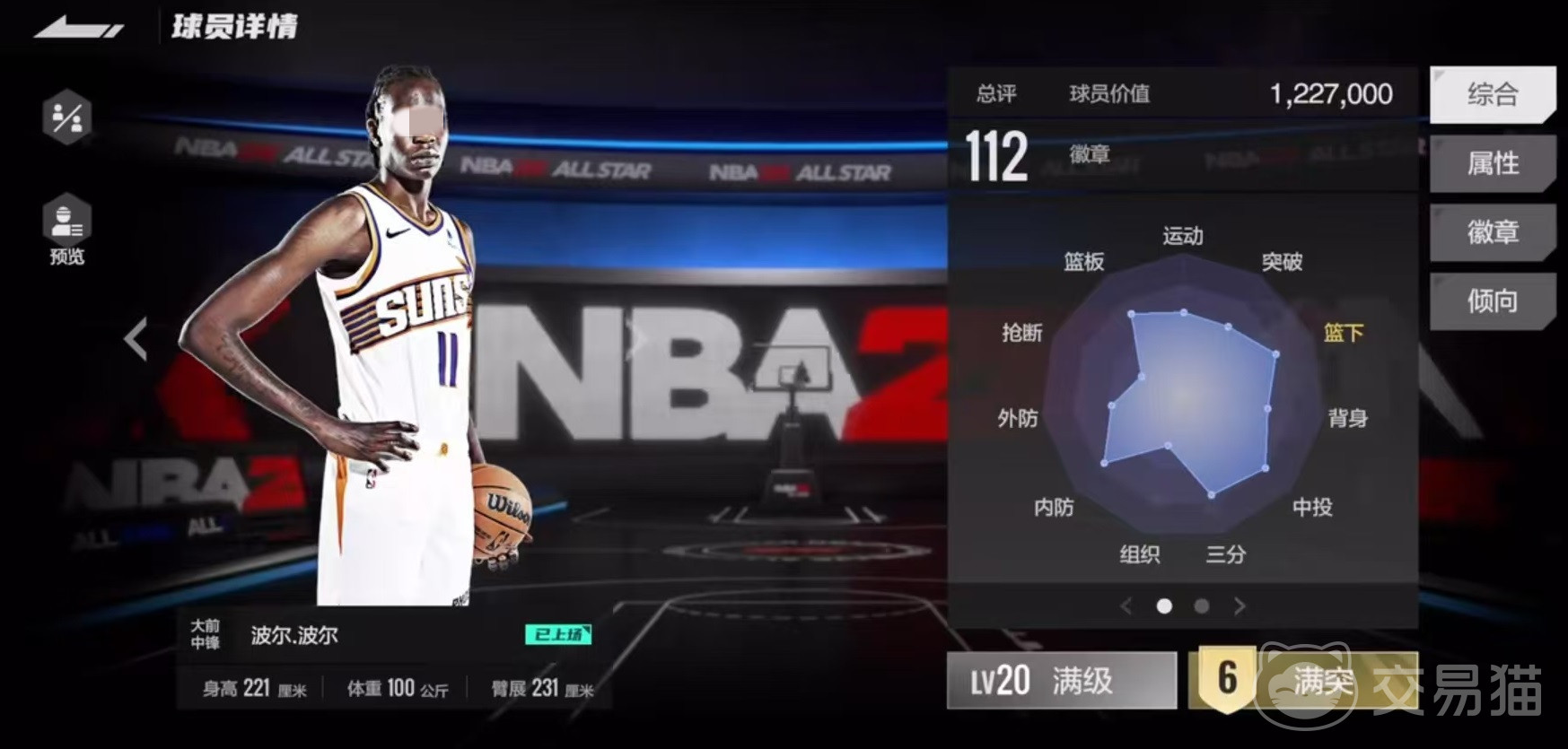 投射属性方面,拥有126的中投,加上120的三分,这样配合起来,让他在场上空间能力绝对不容小觑。防守端,防守篮板133,是一个非常优秀的数值,还有129的盖帽属性,加上自身在模型方面的优势,这一方面堪称是如虎添翼。还拥有133的站扣和101的跑扣,这在内线中也是属于比较高的水准了。97的速度虽然不算太快,但是也能跟上节奏,弹跳99,力量91,确实偏低一些,不过通过自身的身体模型也能够弥补。体力122并不算高,但也绝对不算低,只是要注意合理的进行分配。在实际nba中,波尔波尔已经是征战了6年的老将,但是游戏依然没有给他配置徽章。
