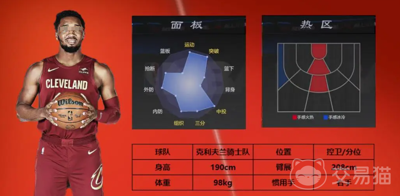 价值100万合同费的米切尔身高190cm,臂展208cm,作为控球后卫,他的身材还算不错,防守端也能起到不错的作用。他的中投能力达到155,三分球133,突破上篮162,突破灌篮150,弹跳162,是一个既能投篮又能突破的全能型球员。
