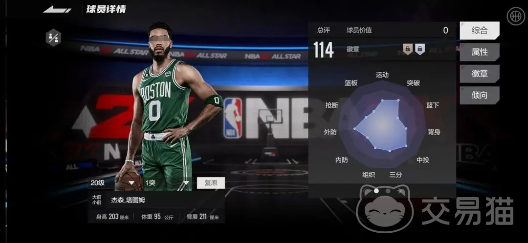 塔图姆在游戏中的定位是大小前锋。其实这都得益于他高挑的身材,有着203cm的身高。以及高达95kg的体重,但能让他在球场上中轻松防守敌人,可避免对方进攻还可以快速进行回防。他最出色的能力就是外防,可以轻松用双手展开防住敌人。