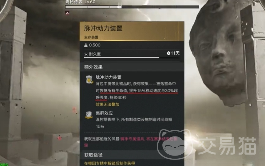 脉冲动力装置所提供的所有增益效果,如生命值恢复、移动速度加快和超感强度提升,将持续60秒。这段时间足以让玩家在关键时刻获得所需的支持,以完成重要的任务或战斗。