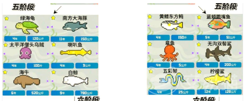 小鱼期平稳度过后就会迎来成鱼期,就是gyao已经从小鱼成为大鱼了。在这个阶段基本上就一定确定最终培养出的gyao是什么品种了,蓝色的小鱼基本上都是河豚、五彩鳗、章鱼和锤头鲨,红色的小鱼则为海象或者是白鲸,其中五彩鳗以及海象这两种成鱼想要使gyao能成功进化,就必须关心饱食度以及娱乐度,只有确保饱食度和娱乐度都能到底1点,而培训值必须为9点才行,锤头鲨以及其他的品种鱼类则饱食度和娱乐度要到达2级或者使3级,培训值必须为9点。