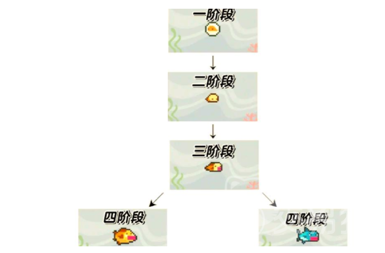 gyao的成长阶段分为三段,分别是幼体阶段、小鱼阶段以及小鱼阶段以及成鱼阶段,幼体、鱼苗和小鱼这三个阶段,我们可以划分成为小鱼期,这个时期是gyao比较脆弱的一个阶段,这个阶段的gyao若是照顾不当就直接死亡,玩家在这个阶段一定要关心它们的饱食度以及娱乐度,在这个阶段中gyao的幼体若是处于一饱食一心情的情况下,就会长成蓝色的小鱼,可若是饱食和心情都非常额高,那就会长成红色的小鱼。