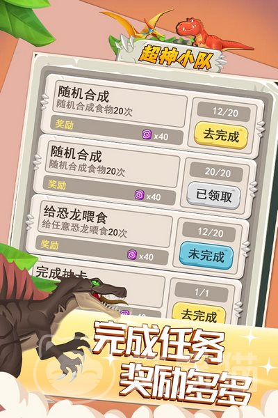超神小队的玩法特别适合各个年龄段的玩家,采用休闲益智的闯关玩法,游戏的画面也是非常凶猛可爱的,并且还加入了宠物收集,以及放置养成等多种内容,超神小队最新版本下载介绍,在这款游戏中为大家构造了,一个庞大的恐龙世界,大家可以来自由的冒险,同时还有强大的敌人需要大家来对抗,游戏主打一个休闲的玩法,可以也来收集各种喜欢的恐龙,并且来进行培养,让他们成长。