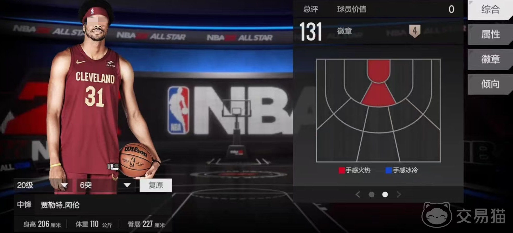 先来看一下贾勒特阿伦的基础模型数据,他的身高206厘米,体重110公斤,臂展227厘米,在场上的热区范围比较小。在属性方面拥有126的中投,这一点还算比较不错,不过主要依据的还是近距离投篮,这一属性为162。进攻篮板118,防守篮板138,内防142,外防105,盖帽101,这些数值都是传统中锋所拥有的正常水准。