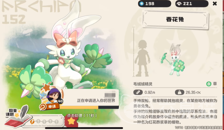 春花兔是个可爱的草系精灵,有着三阶进化形态,手持双枪,能汲取并释放草系魔法,枪头花苞来自有药用价值的红花酢浆草,特性“系统发育”,每当己方精灵释放草系技能时,其攻击力会每次提升10%,在队伍中可持续输出,增加草系队伍整体伤害,推荐技能藤鞭技能和气势一击技能,在PVE场景中,凭借技能“光能聚集”和“根吸收”可打出高续航和爆发,面对弱水、土属性敌人时表现优异,PVP中适合走高速爆发流派,不过防御属性低,容易被秒杀,需要玩家具备较高意识。
