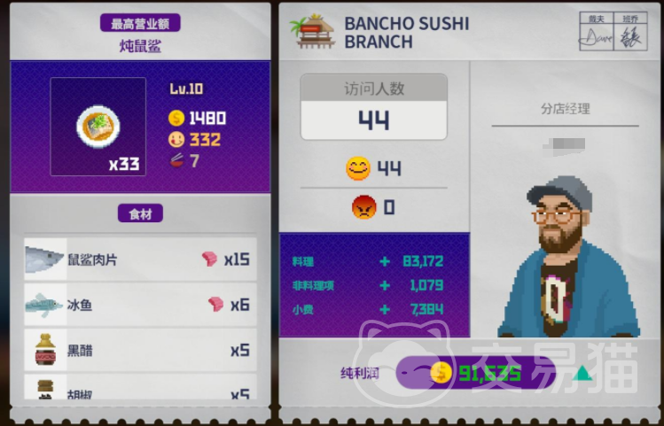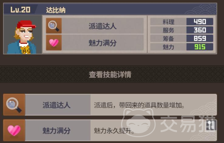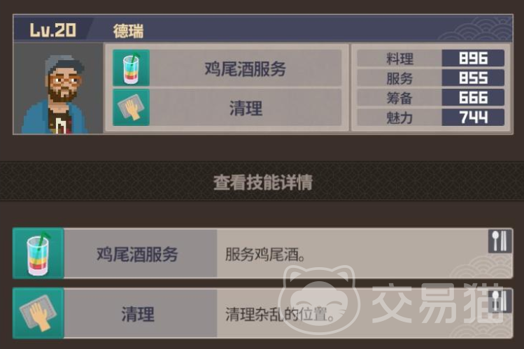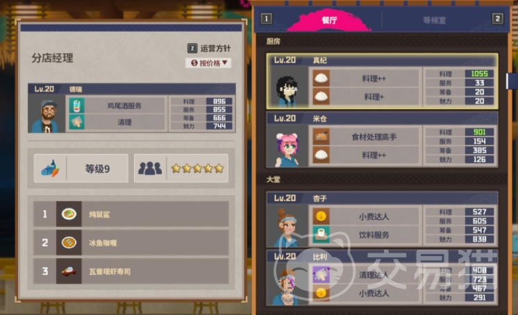 除了主店之外,后期还可以开设分店,饭店这里也需要有相同的配置,最推荐作为分店大堂经理的就是德瑞,这个角色各项分值都是比较优秀的,并且主要可以完成鸡尾酒和清理服务,等这个角色提升到15级之后,还能解锁冰鱼咖喱这道菜,这个角色的技能也表示,不管是在人多的时候充当服务员,还是人少的时候冲他大他经理都是可以的。
