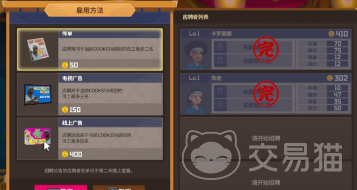 一般前期是不需要员工的,玩家和朋友两个人就能维持店铺的日常工作,后期随着店铺的知名度越来越高,来店铺里点餐的顾客也会更多,这时候在员工的选择上尤为重要,游戏里总共有21个员工,想获得这些员工的话需要通过不同的雇佣方式,其中最推荐的就是通过电视广告的方式去雇佣这些员工,相对来说比较划算,而且应聘的这些员工级别也比较高。