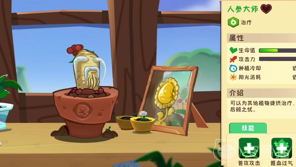 人参大师在游戏内属于辅助型的植物,它可以通过普通攻击的方式,囤积一定的血量恢复能力,在使用的推血过气技能时,可以为周遭所有的植物提供治疗。
