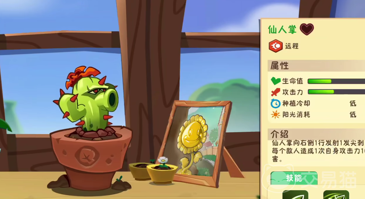 仙人掌的基础攻击力进行了更改,它可以向右侧的目标造成一次尖刺攻击,并且该攻击效果一旦达成后,就会给敌人挂上一层毒属性的裂伤伤害,仙人掌整体的冷却时间非常短,需要消耗的阳光数量也是比较少的,固然出场率在白天场景非常高。