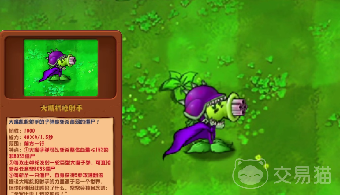 大嘴机枪射手可以向前方发射食人花,并且它拥有一千点的韧性,威力数值为160点,可以向前方的一行目标大量的发射食人花,并且,食人花在面对血量低于15%的僵尸时,可以立刻秒杀。