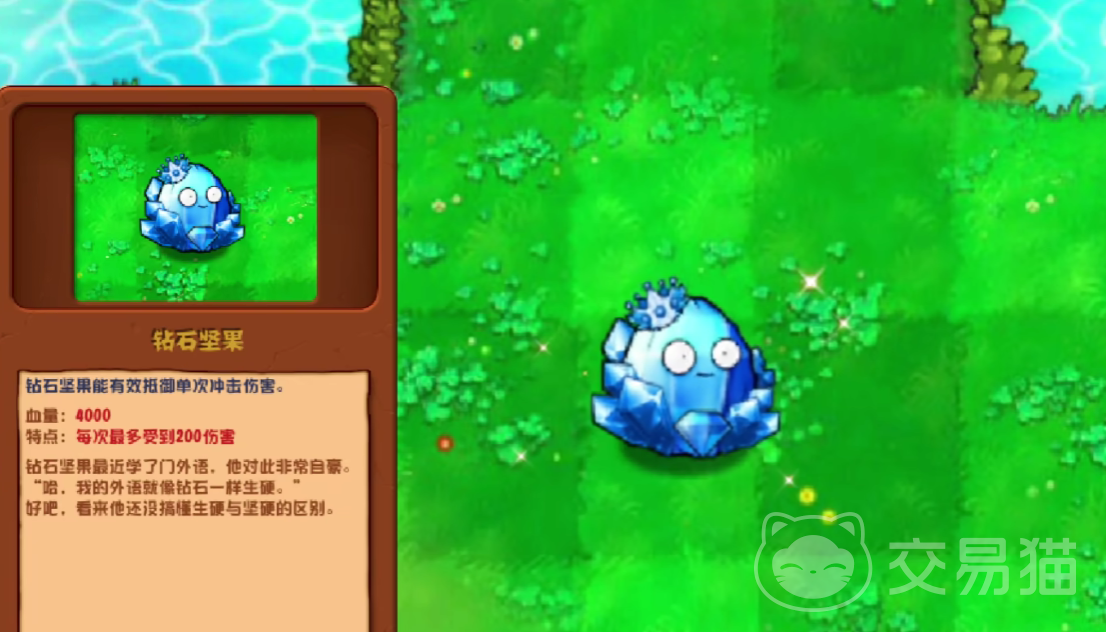 钻石坚果属于游戏当中防御能力最强的一个坚果了,它的基础血量高达四千,并且拥有特技,每一次受到的攻击最多为两百点,固然,在面对冲锋型单体伤害时,钻石坚果是游戏内最强的一个植物。