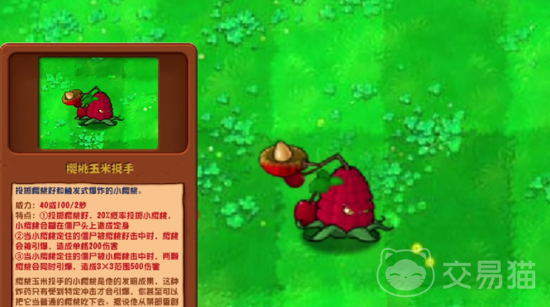 樱桃玉米射手是本次版本当中最强大的一个植物,由于它能够向前方发射樱桃炸弹,并且樱桃玉米射手在进行进阶之后,威力高达一百点,投掷成功时,樱桃玉米射手有20%的概率可以投掷小樱桃,小樱桃能够直接定身敌人。
