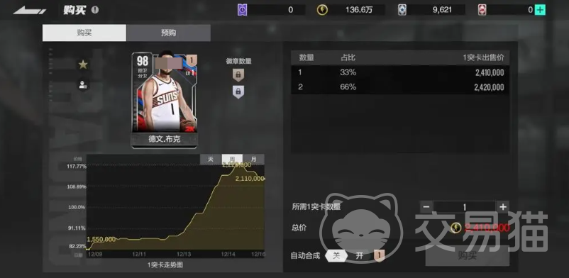 目前布克在交易市场的合同费已经涨到230万,前期培养或作为长期投资都是不错的选择。尽管布克的投篮包不算是顶尖,但动作顺滑,空位接球要果断出手,否则容易被防守干扰。独特的运球包赋予了布克独特的篮球风格,虽爆发速度一般,但银色的第一步大师徽章能略微弥补不足。持球能力方面,稳居现役前三,尤其是扣篮包表现出色。尽管198cm的身高在防守端有所不足,但进攻端的精准投射和飘逸跳投还是吸引了很多人去选用。