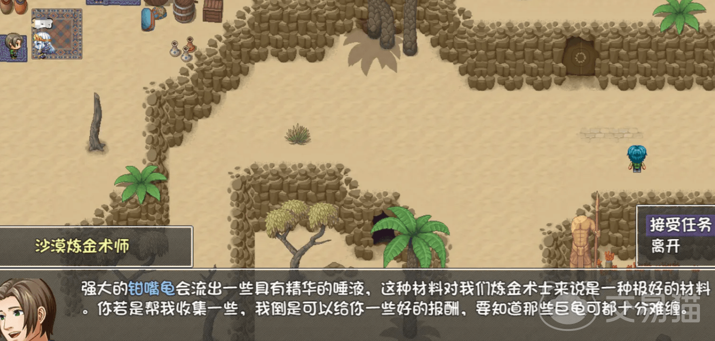 来到地图的左上角,和沙漠炼金术师对话接取,该任务有2个阶段,第一阶段要5个巨龟的唾液,击杀掉巨龟BOSS能获得,这里会有刷取技巧,那就是去副本里面必定会有1只巨龟BOSS,然后第二阶段要10个沙棘花,打稀有boss不死者能顺利获得,全部提交后能得到重要物品戒指。