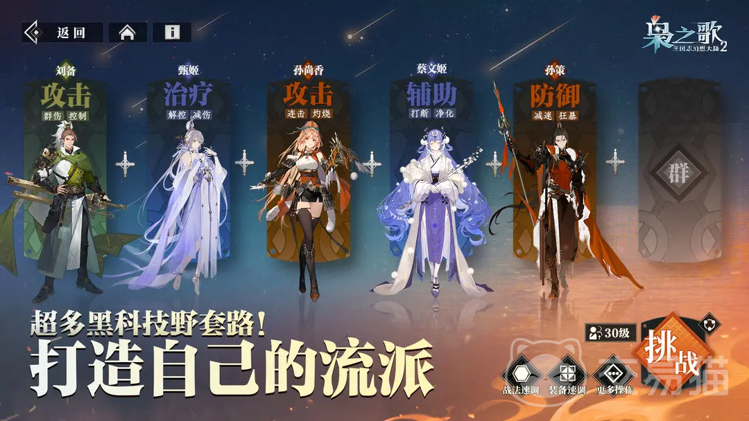 美术风格方面,有两个关键词可以总结,其一“硬派二次元”,其二“新国风浪漫主义”。在角色设计这块,官方尝试从不同方向去努力,在保证整体调性统一,更大限度的将武将风采和神韵展现出来,前作中受到喜爱的角色,也选择性得到保留了设计,但是更多的还是进行了改动与创新,给大家眼前一亮的感觉。