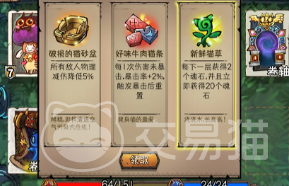 这是相当关键的一步,游戏中有各种效果不同的神器,这些神器会在固定的关卡出现,出现后会随机跳出三种效果的神器,大家需要在其中选择一种,在选择以后就需要走这神器的流派,就比如选了新鲜猫草,那就需要直接走刷钱的流派的,如果选的是好味牛肉猫条的话,那就需要选择双暴流。大家需要按这样去操作,选择一个自己想要去玩的神器,构建一个有关这流派完整的体系,在能构建好后这游戏也就会玩了。