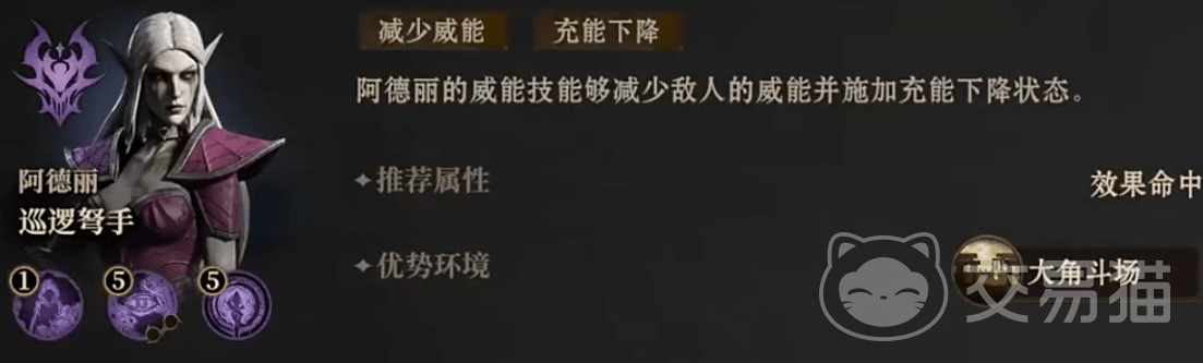 她的被动是无视处于减益中敌人30%的豁免值,战技会对敌人形成360%黯蚀伤害,并100%降低其25%的专注,大招会向着敌人射出3箭,每一箭都会形成280%黯蚀伤害,减少其10%的威能值同时有75%概率让目标的充能速度降低。