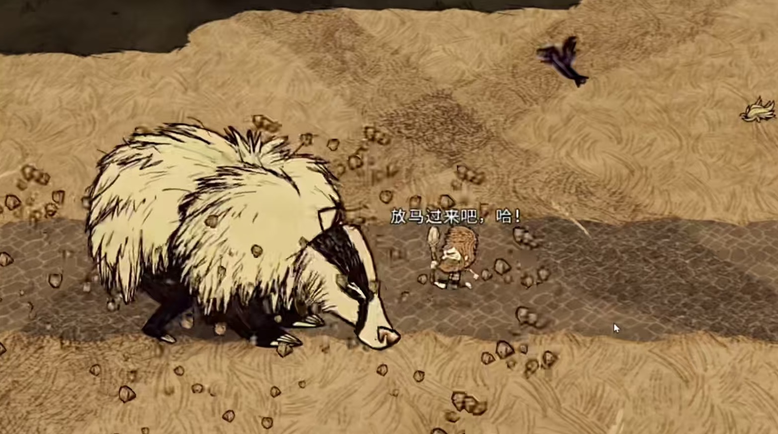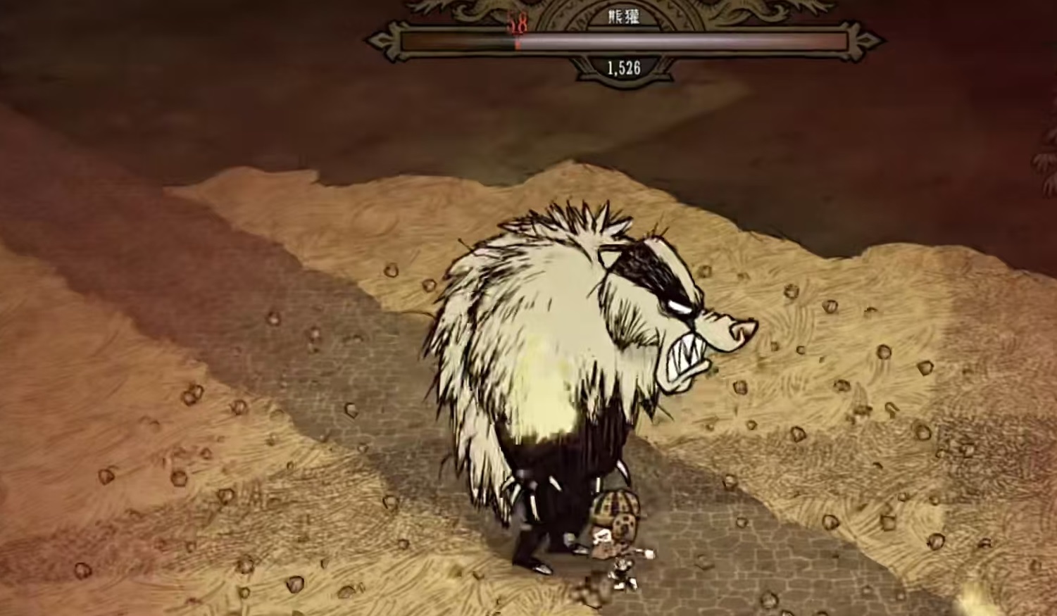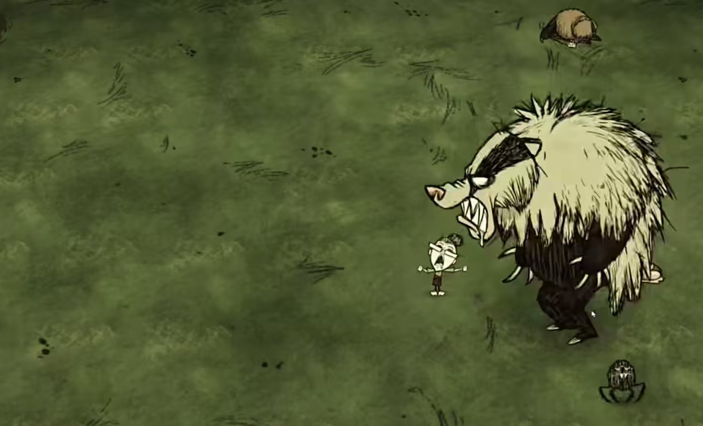 这个boss也有独特的行为模式,那就是它有着冬眠的习惯。在联机版中虽然不会因为季节而消失,但是在冬春会进入到冬眠状态,夏秋两季出来活动。如果处于冬眠状态下去攻击熊獾,苏醒后会对大范围内的生物和玩家进行长达10秒的催眠。在中立状态下,如果玩家去和熊獾争夺食物,他会进行警告,连续三次后就会产生仇恨,这时往地下扔熊獾就可以终止仇恨。熊獾比较害怕火焰,当身边有火焰时就会惊慌失措,到处逃窜,在此期间移动速度提升,进入到高速模式。