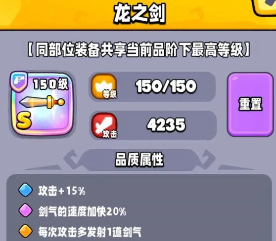 能加15%的攻击和20%的剑气速度,每次攻击都会多发射一道范围大的剑气,由于伤害分散的特性非常适合打小怪数量多的关卡。