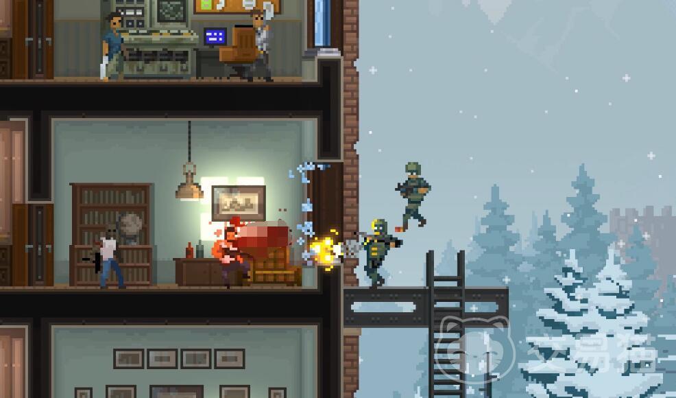 喜欢像素风的朋友,这个作品肯定很合你的胃口,设计人员用像素级别的画面,呈现出了极致的场景破坏,轰碎墙壁、炸飞油桶、点燃毒气罐等场面轮番上演,像素碎片与爆炸特效疯狂堆叠,满屏血腥番茄酱却莫名治愈。游戏中可用的武器也很丰富,从消音手枪到火焰喷射器,从电击陷阱到警犬突袭,每种武器都自带物理反馈,让你能在对战中收获舒适的手感。