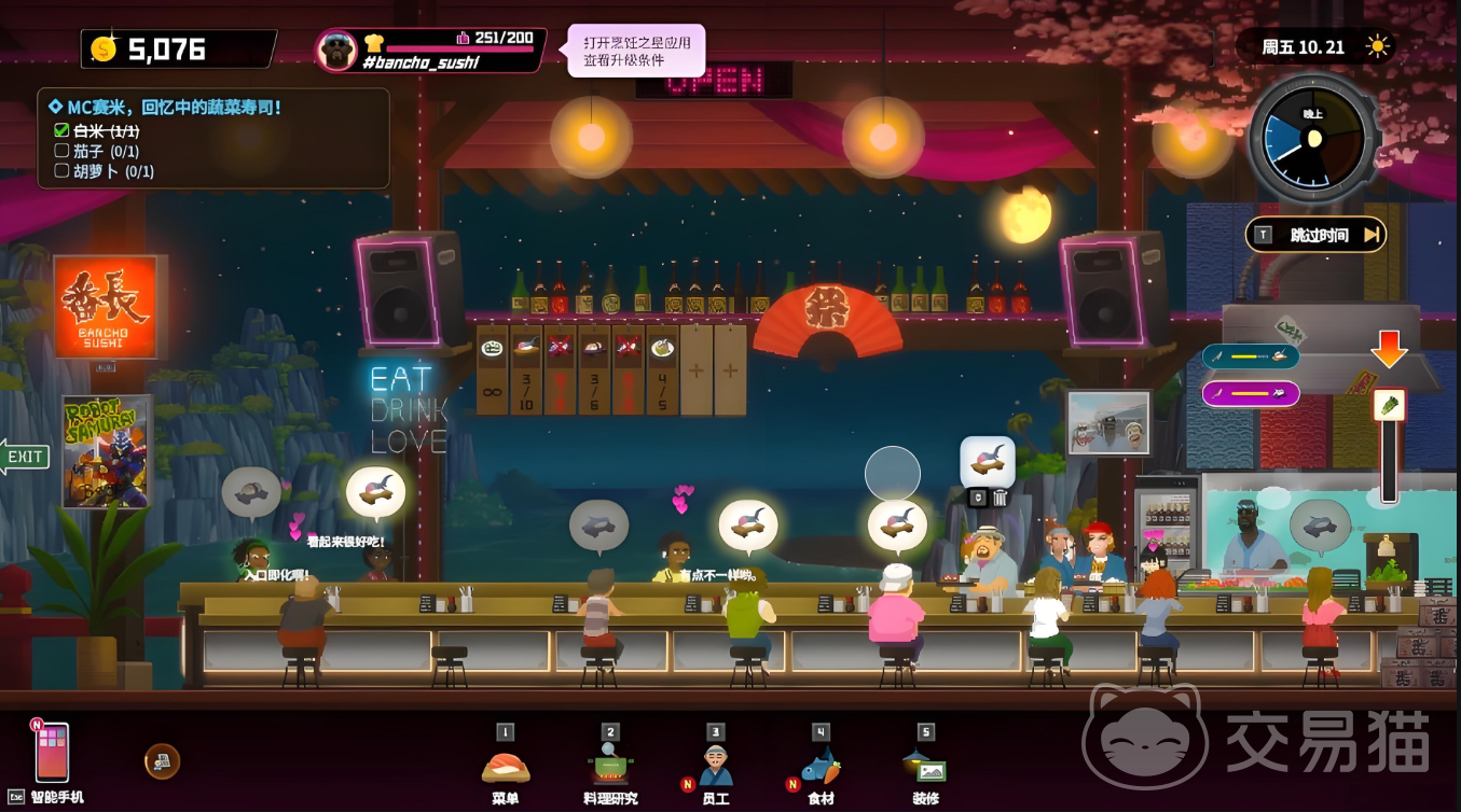 最后大家要知道,夜晚是属于寿司店经营的时间,我们花费时间捕捉鳗鱼,寿司店的经营时间就会缩短,会减少寿司店赚钱的机会,如果大家一定要捕捉鳗鱼,那就只能舍弃晚上的部分收益,在海中夜潜获取。我们在武器的选择也要灵活多变,选择可以保证我们安全的武器进行。