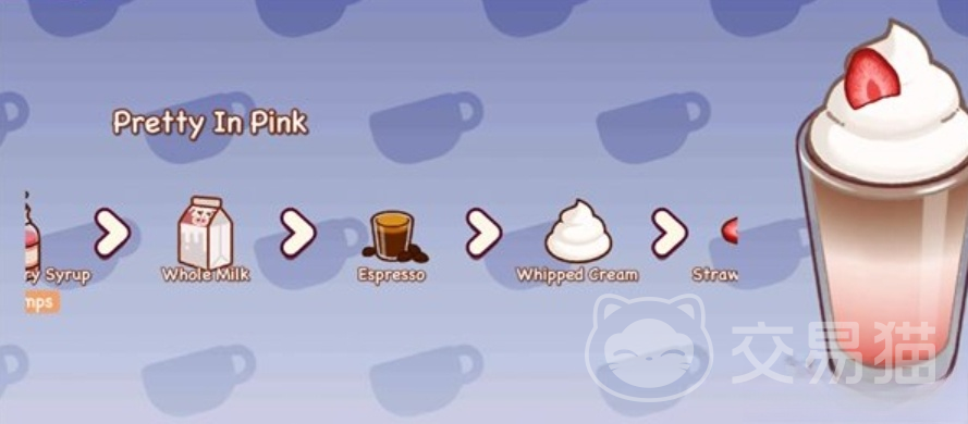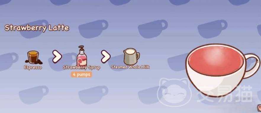 草莓拿铁咖啡是在拿铁咖啡前提下添加草莓糖桨制成的,在游戏中,玩家需要把12mL浓缩咖啡、4泵草莓糖桨与适当牛乳泡沫混和,设计12mL草莓拿铁咖啡。