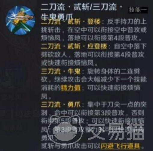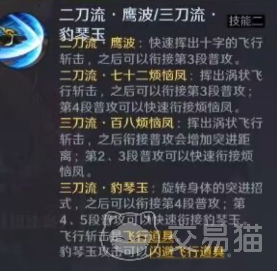 在二刀流和三刀流情况下,1技能和2技能也会有变化。1技能二刀流是上挑接下劈,三刀流是横着旋转接突刺。2技能二刀流是十字位移斩击接涡状飞行斩击,三刀流则是直接放出涡状斩击然后再接普攻突进。