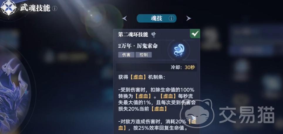如果主动使用的话就可以让鬼魅附体,之后我们可以造成伤害,并且按照比例化为虚血。就是说伤害越高,你的回血量就越充足。魂环年限的附加效果就是吸魂,可以让你更快的回复魂力。
