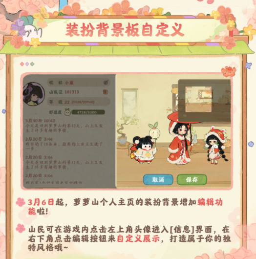 除了对于玩家个人建筑的玩法增多之外,在这个游戏里还会举办花神游园会,和好友一起进入到这个充满浪漫的春日,一起祈福许愿,另外在两周年的活动中,每个玩家都可以在甲级建筑里面任选其中一个装扮自己的城镇,为了能让每个人有更加不同的风格呈现,个人的主页也支持自由的背景装扮,能展现个人风格的同时也可以更换和这个周年活动相匹配的主题套装。