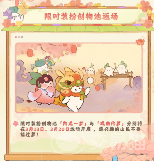 两周年的活动会从3月6号开始,在这个阶段完成任务就能获得游戏里的限定建筑,还有各种主题家具,还有游戏里角色的装扮和头像,另外在这个阶段还会推出特色的主题家具,可以通过连续签到10天获得装扮卷轴,然后用这些装扮卷轴去购买家具,除了常规的建筑之外,游戏里还会有一些现实的up建筑创物池,游戏里除了房屋的建造和装饰之外,还会有非常可爱的小萝卜陪伴玩家,在两周年的活动中,小萝卜也会拥有切合主题的角色装扮,玩家可以通过完成任务获取装扮,让小萝卜有一个全新的样貌呈现。