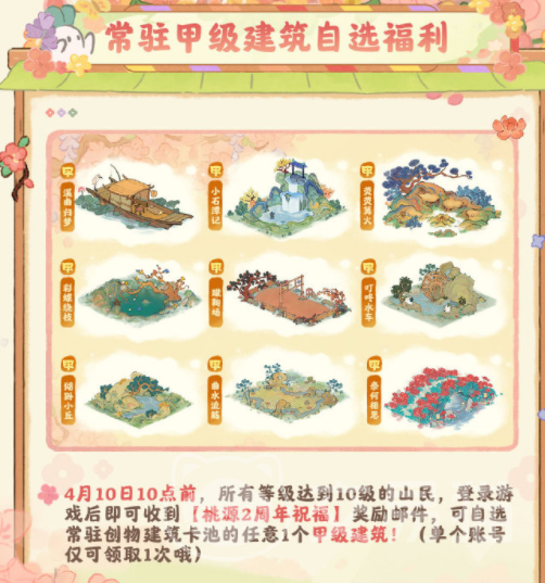 两周年的的活动会从3月6号一直持续到4月6号,在这一个月的时间里,只要签到满10天就可以获得建筑卷轴和装扮卷轴,不过这是对等级有要求的玩家需要,让个人的等级达到16级才可以,另外游戏里还新增了很多建造奖励,完成这些建造之后就可以领取大量的材料,可以用来扩容谷仓或者是城市的面积,关于这些建筑也上架了大量的主题套装,可以在这些甲等和乙等,丙等多种不同等级的建筑里,使用桃月笺兑换。