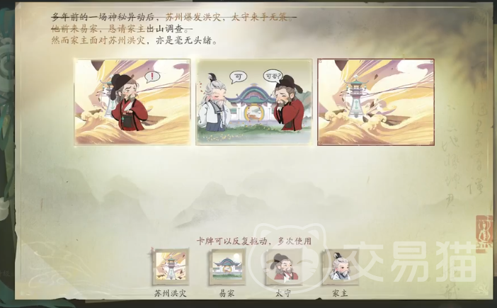 完成这一关考验之后,可以看到旁边有一本发光的手册,要按照手册上的要求完成苏州洪灾的调查,需要分别把下面的几个卡牌拖动上去,首先玩家可以先把第一个苏州洪灾,放置到第一个方块中,接着把太守,继续拖动到苏州洪灾这个方块上,然后在第二个方块上放置易家这个背景,上面分别放置家主和太守,接着第三个方块,只需要再次放置苏州洪灾即可。