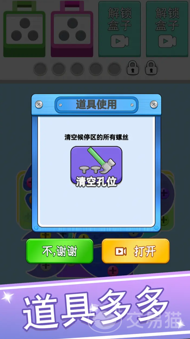 如果小伙伴们觉得关卡过于困难,也无需担心,在屏幕的下方,还有一些道具可供玩家们使用。它们分别不同的作用,有些可以帮助大家获得更多的空位,而有些则可以帮助你直接移走一些工具箱。总之当你需要打发时间的时候,选择这款游戏是绝对不会错的。