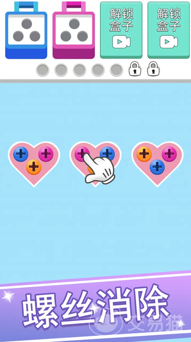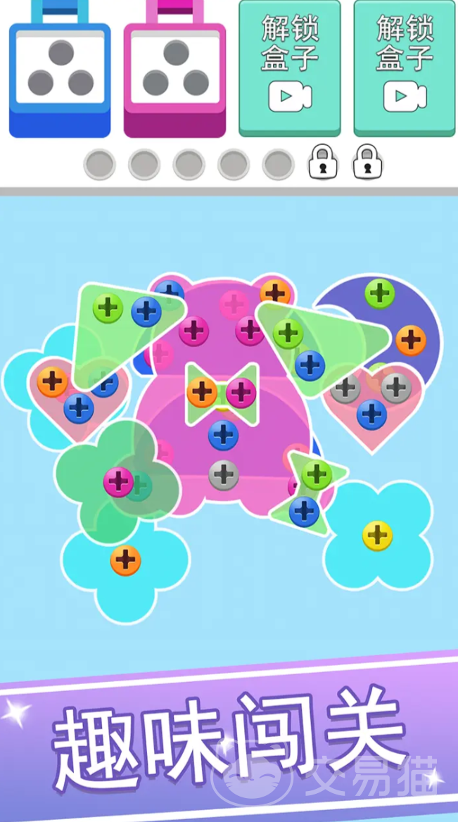 这款游戏上手非常简单,小伙伴们可以看到在屏幕上有着一些彩色的工具箱,而大家要做的就是从下面的图片中挑选颜色合适的钉子,并且把它们给放到工具箱中,当你集齐三个同样颜色的钉子之后,就能够顺利获得分数,并且拿到下一个不同颜色的工具箱。在屏幕的中间还有着5个空位,可以帮助小伙伴们暂时存放放不下的钉子。
