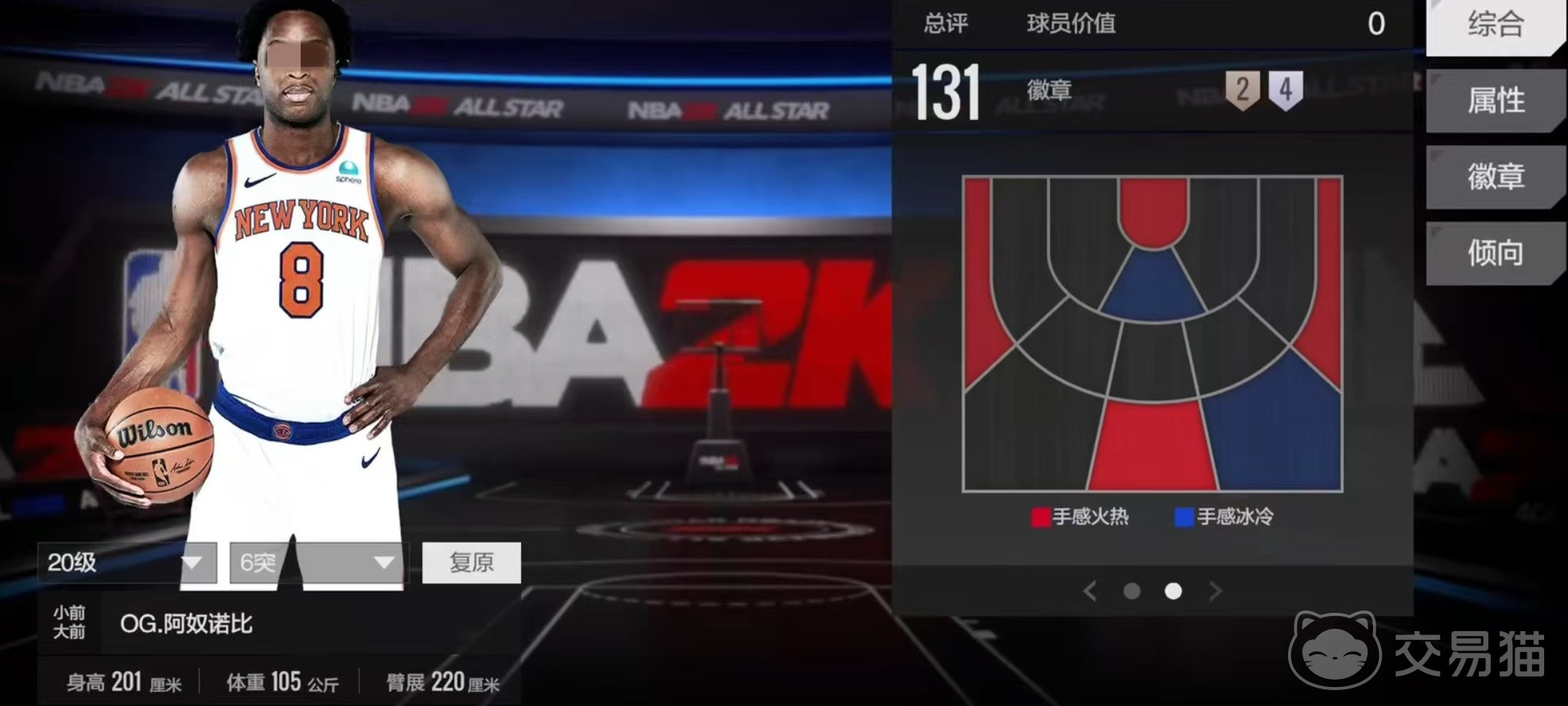 OG阿奴诺比是属于小前锋或大前锋位置,它在达到20级6突的时候,属性方面还是比较出色的,尤其是在和同价位其他球员对比,更是有着一些优势。在基础数据方面,OG阿奴诺比身高201厘米,体重105公斤,臂展220厘米,投篮方面热区在两边底角和弧顶,一共有三块热区,在右侧45度角区域是手感冰冷的区域,这三个区域分布是比较均衡,所以进攻的时候,投篮位置是比较灵活的。