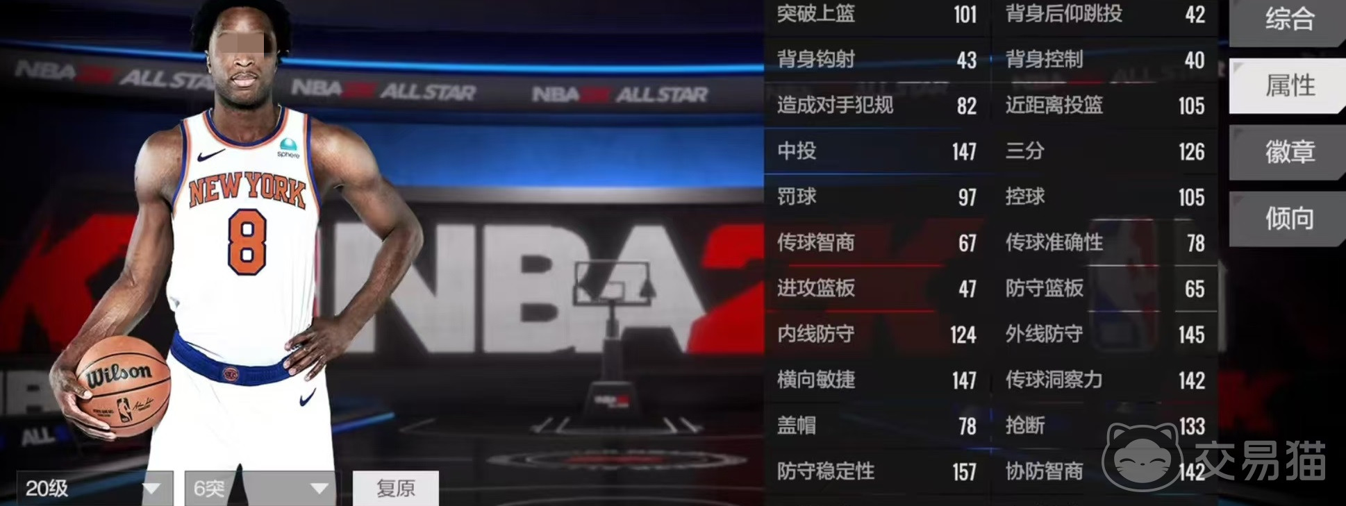 再来看一下更加详细的属性,投射得分方面,中投147,三分126,近距离投篮105,这些数据中,中投还是比较不错的,也是主要得分手段。防守方面,篮板球当然是弱项,进攻篮板47,防守篮板65,聊胜于无,其他防守方面还比较不错,内线防守124,外线防守145,横向敏捷147,抢断133,防守稳定性157,这些属性对于大前锋或者是小前锋来说,防守方面还是能拿得出手。值得一提的是,在灌篮方面原地灌篮只有82,但是突破灌篮达到了133,这样也相当于增加了得分的手段。
