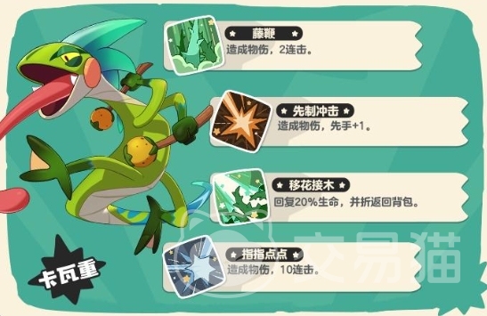 在物理技能方面,藤鞭是一种经典的双重攻击技能,适合在战斗开始时稳定地输出伤害;而先制冲击则具备+1的先手效果,能够帮助卡瓦重抢占先机,迅速压制对手。对于需要保命的情况,移花接木是一个非常实用的技能,不仅能够恢复卡瓦重20%的生命值,还能将其撤回背包,避免被击败。最后,指指点点是一个10连击技能,累计伤害极高,同时还能够针对对手的被动特性,是一个非常灵活的技能选择。