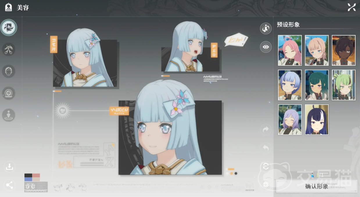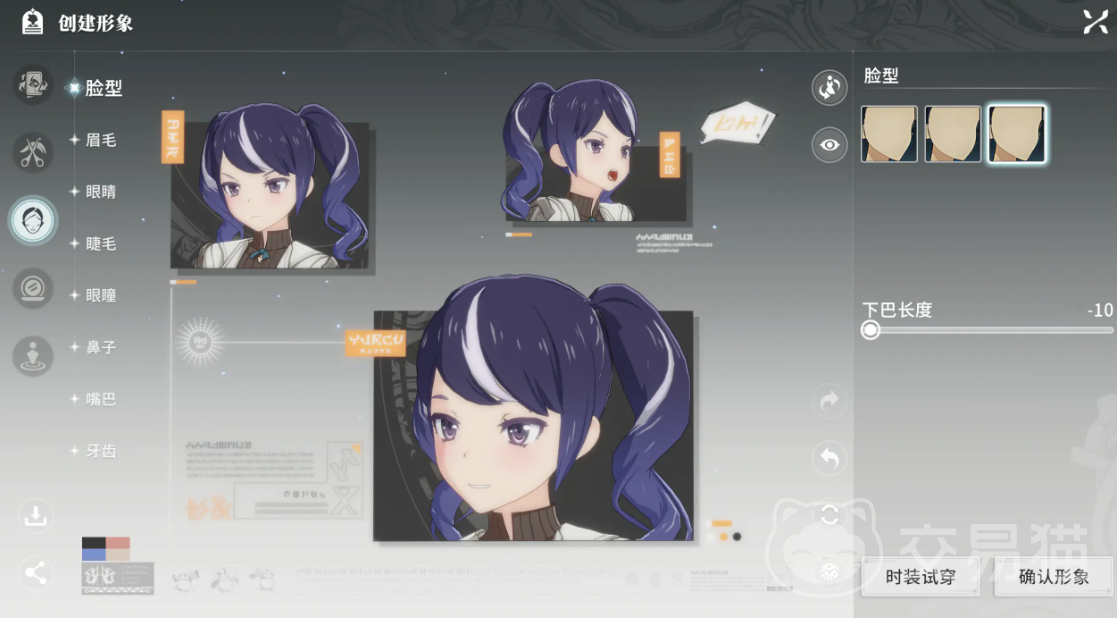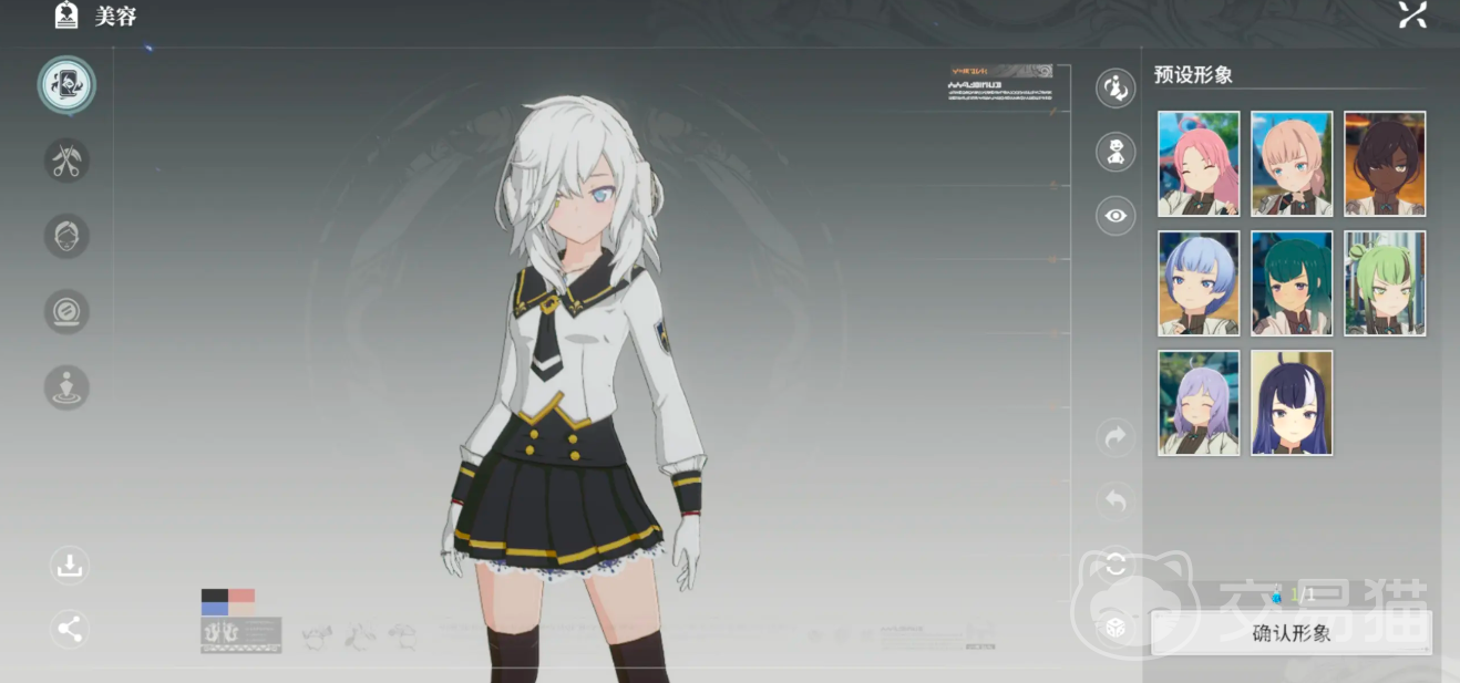 美容部分分为:预设形象、发型调整、脸型调整、面部特征、体型调整。预设前面提到过了,预设形象选择界面支持时装试穿,可提前查看角色在不同服装下的效果。