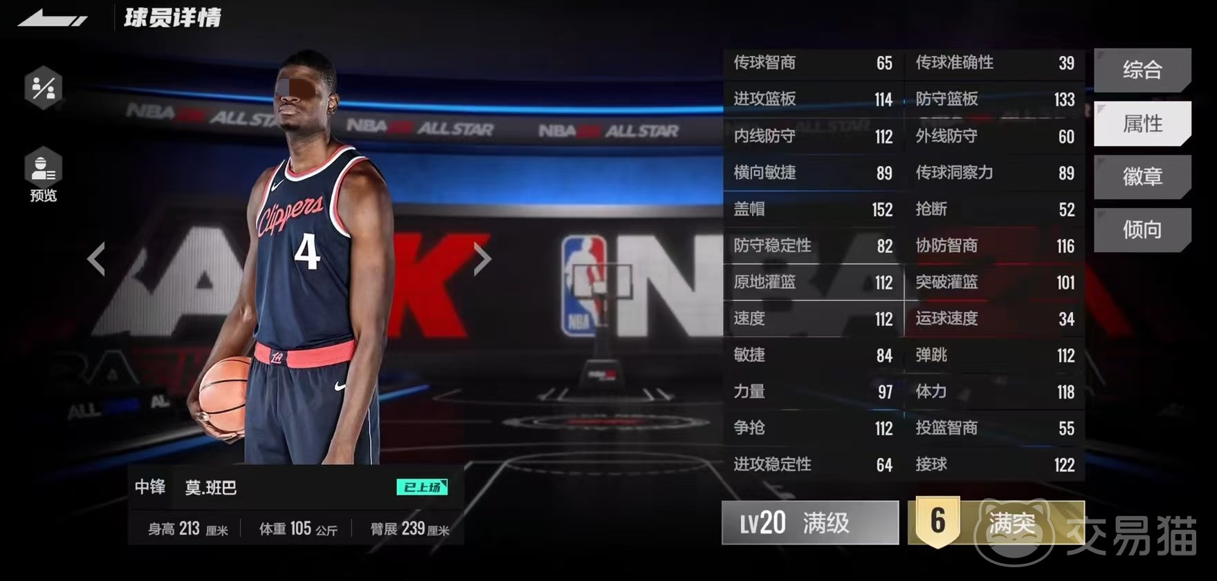 在属性方面也有一些属性是可圈可点的,例如自身的三分120,这样的属性拉开空间完全够用了,配合上弧顶位置的热区,投射的命中率还是很可观。篮板方面,进攻篮板114,防守篮板133,这两个篮板数值中规中矩,另外两个防守属性,内线防守112,外线防守60,内线防守还是不错的,但是外线防守就比较拉垮了。不过防守是一个综合的体系,外防拉胯并不影响他在防守方面的作用。自身236的臂展在模型方面就已经占据了绝大优势,而且还有152的盖帽,这样在篮下封盖对方完全不是问题。