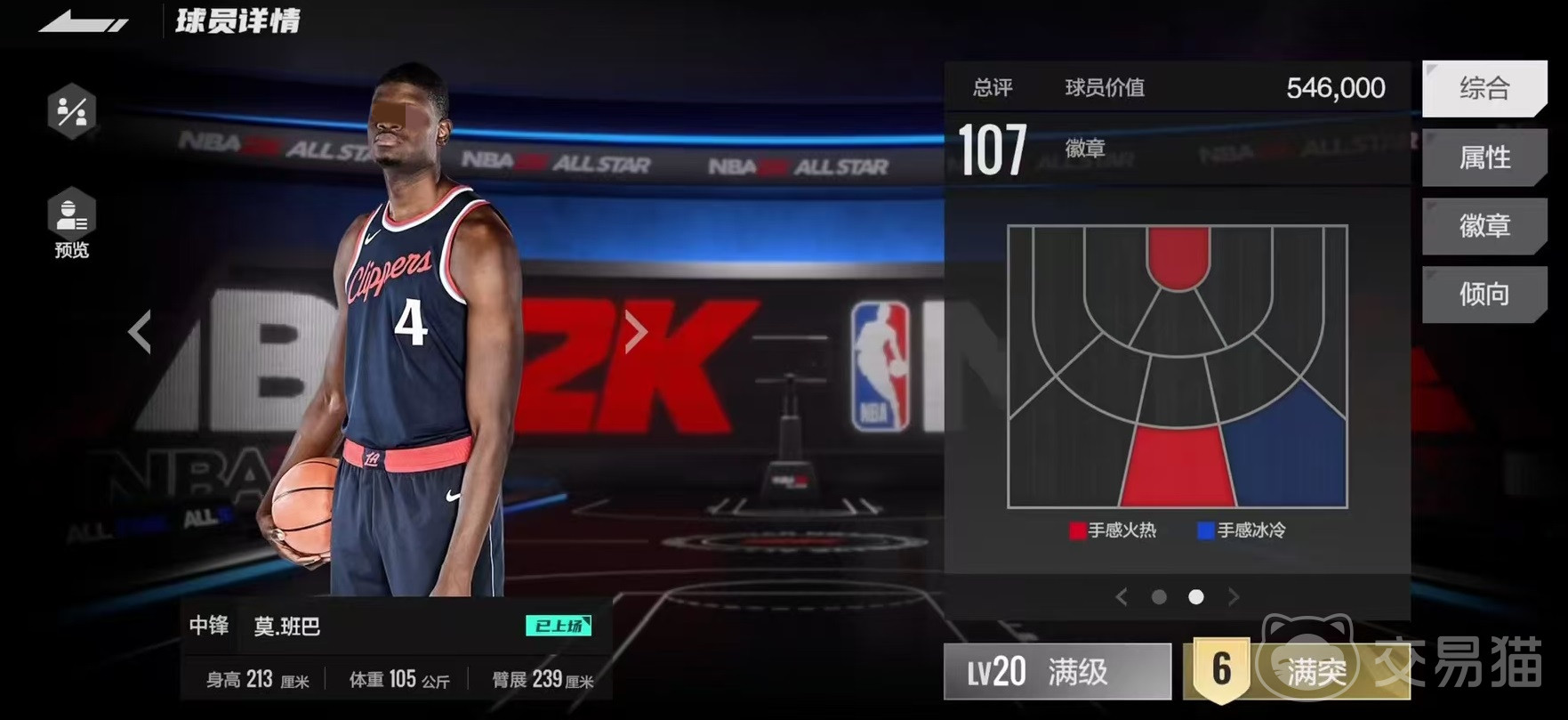 莫班巴是游戏中非常有潜力的一名中锋型的球员,他自身身价比较低,是一个非常适合平民玩家所选择的中锋。当然除了价格优惠之外,身体方面的数据和其他属性,也是选择它的重要原因。他的身高213厘米,体重105公斤,臂展235厘米,出色的臂展,在众多中锋中都是极为优秀的一个,这样的身体模型使他完全可以胜任绝大多数场景战斗。他在三分方面弧顶位置有一块热区,在左侧45度区是一块冷区,所以大家投篮时候一定要区分好这两个位置。