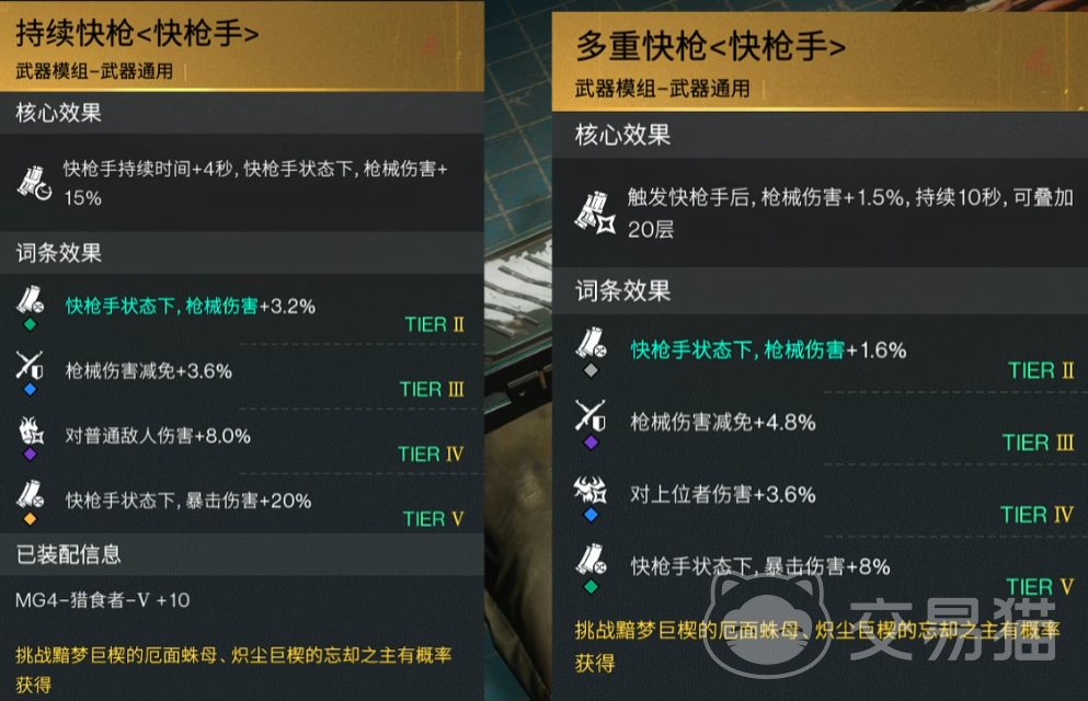 快枪手还有一个效果是持续命中同一个目标枪械伤害提升,最多30层,切目标减一半层数。这个效果很针对精英怪和boss。最后一条则是超过弹匣容量50%的时候攻击力加40%。