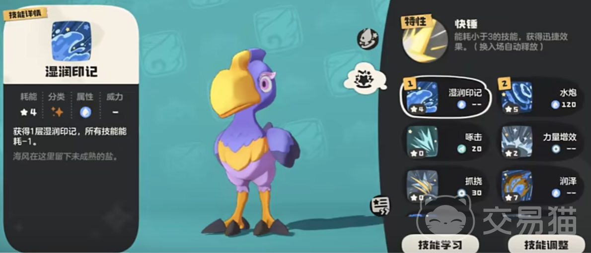 它们会发出尖锐刺耳的声音,让人不想靠近,特性是在释放能耗小于3的技能时,获得迅捷效果,它的啄击会进行2次连击形成物伤,湿润印记会获得1层印记,并让所有招式能耗减1,风起会获得风起印记,每次先手攻击时伤害提升30%,气泡会对敌人形成水属性魔伤。