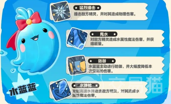 它的头顶上有一个红色的蝴蝶结,特性是在使用水系技时,让所有招式能耗减1,它的甩水能对敌方形成水系魔法伤害,防御能降低自己本轮遭受到的伤害,水弹枪会发射出速度很快的子弹攻击。